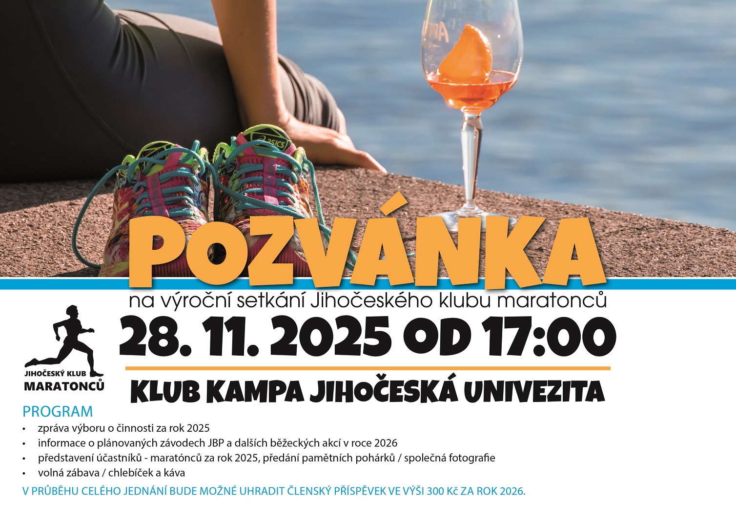 Již tento pátek 28. listopadu nás čeká výroční zasedání Jihočeského klubu maratónců. Pozvánku máte v příloze. Kdo je zván? Je to jednoduché, jsou to všichni maratónci, ultramaratónci, železné ženy a železní muži, co uběhli maratón v roce 2025 a mají bydliště v Jihočeském kraji nebo příslušnost k nějakému sportovnímu klubu v Jihočeském kraji. Kdo to je, víte nejlépe vy sami, takže úplný seznam neposílám a kompletní statistiky udělám až skončí rok 2025. Dále jsou zváni členové výboru klubu, ředitelé jihočeských maratónských závodů, řádně registrovaní členové klubu u Českého atletického svazu (ti nemusí mít odběhnutý maratón, zpravidla mají také běžeckou licenci). Dále se členem klubu stávají i ti, co se ještě letos na nějaký maraton chystají a jsou pevně rozhodnuti jej uběhnout. Dále jsou co nejsrdečněji zváni řádní a doživotní členové našeho klubu Zdeněk Kopecký, Zdeněk Mikšovský a Václav Klíma. A také jsou zváni naši sponzoři!