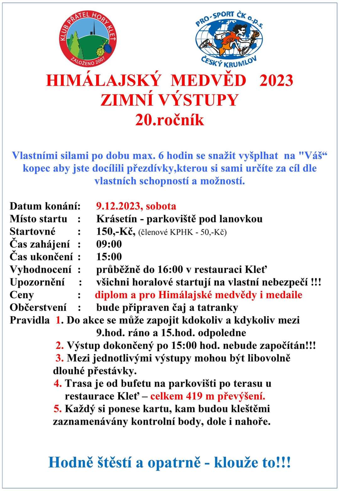 sobota 9.12. Himalájský medvěd, 20. ročník, opakované výstupy na Kleť od 9 hodin do 15 hodin. Propozice v příloze.