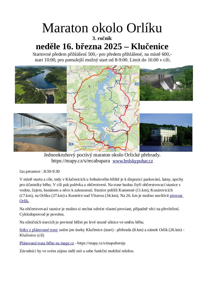 neděle 16.3. Klučenice, Orlík, Maratón okolo Orlíku, závod malý kousek za hranice Jihočeského kraje, propozice v příloze a podrobnosti zde: https://facebook.com/events/s/maraton-okolo-orliku-3-rocnik/1326048635260181/